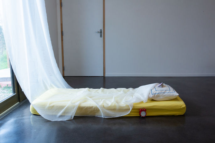Une personne dort pendant le vernissage, le lit prendra la forme de son corps et quand elle ne sera plus là, il sera alors facile de l’imaginer encore. Un matelas vide nous raconte toujours qu’il est possible que quelqu’un puisse y dormir.
